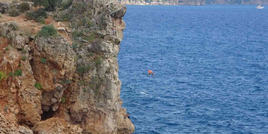 Turizm şehri Antalya'da son günlerde havaların ısınması ile dünyaca ünlü Konyaaltı Sahili vatandaşların ve tatilcilerin akınına uğruyor. Pazar gününü değerlendirmek isteyen vatandaşlar, sahile gelerek serin suyun keyfini sürdü. Sahile gelen bazı gençlerin macera uğruna yaptıkları ise adeta yürekleri ağza getirdi. Gençlerden bazıları 30 metre yükseklikteki falezlerden denize balıklama atlayış gerçekleştirdi. Tatilcilerin yüreklerini ağzına getiren gençler, ölümle burun buruna geldi.
