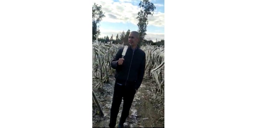 Adana'nın Kozan ilçesinde ejder meyvesi üretimi yapan Mustafa Akçoban, sabah bahçesindeki ağaçlarda oluşan buz sarkıtlarını görünce büyük şaşkınlık yaşadı. Adana gibi sıcak bir bölgede buz sarkıtları oluşmasının inanılmaz bir durum olduğunu dile getiren Akçoban, sarkıtlardan birini eline alıp mikrofon gibi kullanarak haber sunumu yaptı.