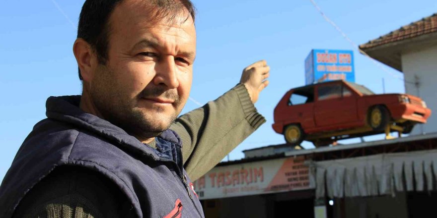 Erdemli ilçesi Tömük Mahallesi'nde 20 yıldır oto tamircilik yapan Mehmet Şahin Doğan, kendisi ile kardeşinin 7, komşularının ise 4 yıl kullandığı otomobili çatıya çıkarıp hem adres tarifi hem de tabela olarak kullanmaya başladı. 4 yıl önce vinç yardımı ile iş yerinin çatısına çıkartılan 28 yaşındaki otomobil hem yoldan geçenlerin dikkatini çektiği, hem de adres tarifi için kolaylık sağladığı belirtildi.