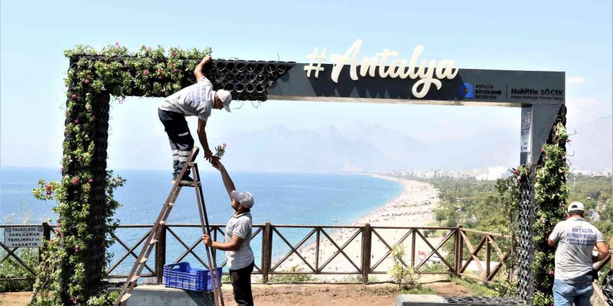 Antalya Büyükşehir Belediyesi'nin Konyaaltı sahilini kuşbakışı gören Varyant Seyir Terası'na yaptırdığı ve aşırı sıcaklara dayanamayarak çiçekleri kuruyan simge çerçeve yeniden yeşillendirildi.