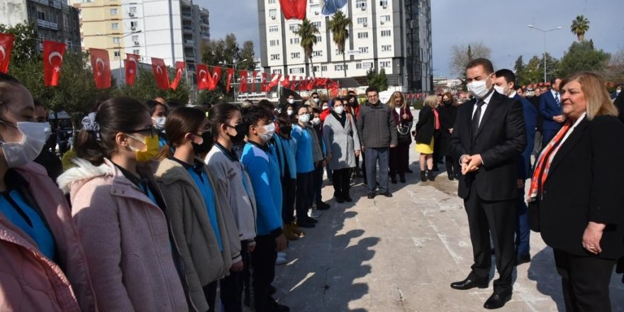 Saygı duruşu ve İstiklal Marşı'nın okunmasının ardından Ceyhan Kaymakamı Dr. Bayram Yılmaz, Ceyhan Belediye Başkanı Hülya Erdem ile Ceyhan Gazi ve Şehit Aileleri Derneği Başkanı Ayşe Muhacir, Atatürk büstüne çelenk sundu.