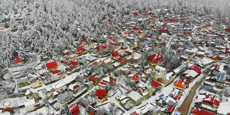 Osmaniye'de Amanos Dağları'nda yer alan Zorkun Yaylası kar yağışıyla birlikte beyaz gelinliğini giyerken, ortaya çıkan kartpostallık görüntüler drone ile havadan görüntülendi.