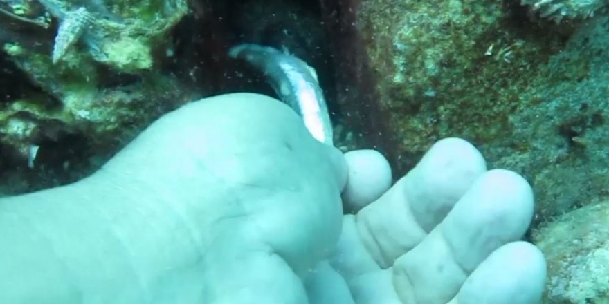 Su altı dalışları ve çektiği görüntülerle bilinen Akdeniz Üniversitesi Su Ürünleri Fakültesinden Prof. Dr. Mehmet Gökoğlu, geçtiğimiz günlerde Konyaaltı açıklarında dalış gerçekleştirdi. Kayalık alanda Müren balığıyla karşılaşan Gökoğlu, yanında getirdiği 3 tane dondurulmuş hamsi balığını eliyle Müren balığına verdi. Saldırganlığı ve keskin dişleriyle bilinen Müren balığı, kendisine sunulan ziyafeti geri çevirmeyerek hamsileri yedi.