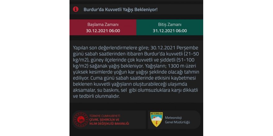 Meteoroloji Genel Müdürlüğü Analiz ve Tahmin Merkezinden yapılan son değerlendirmelere göre 30 Aralık 2021 Perşembe günü sabah saatlerinden itibaren Burdur'da kuvvetli (21-50 kg/m2), güney ilçelerinde çok kuvvetli ve şiddetli (51-100 kg/m2) sağanak yağış bekleniyor. Yağışların 1300 metre rakım üzeri yüksek kesimlerde yoğun kar yağışı şeklinde olacağı tahmin ediliyor. Meteoroloji Müdürlüğü tarafından yapılan açıklamada, "Cuma günü sabah saatlerinde etkisini kaybetmesi beklenen kuvvetli yağışların oluşturabileceği ulaşımda aksamalar, su baskını, sel gibi olumsuzluklara karşı dikkatli ve tedbirli olunmalıdır" uyarısında bulundu.
