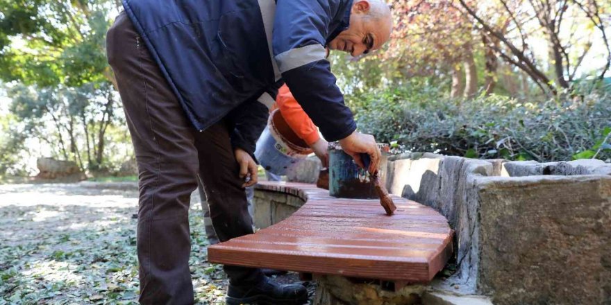 Antalya Büyükşehir Belediyesi, Kaş'tan Gazipaşa'ya kadar sorumlu olduğu parklarda bankların bakımını yapıyor.