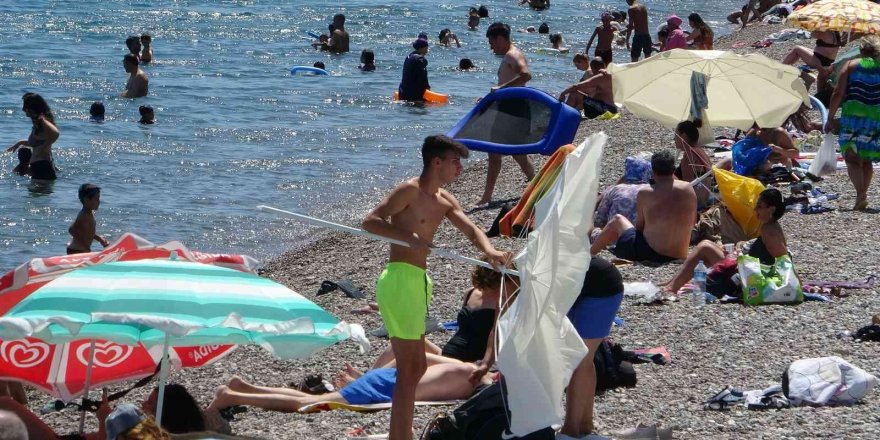 Antalya'da 37 dereceyi bulan sıcakta bunalarak kendilerini dünyaca ünlü sahilde Akdeniz'in serin sularına bırakan tatilcilerin esen rüzgardan ötürü havalanan plaj şemsiyeleri ile imtihanı kameralara yansıdı. Bazı şemsiyeler tatilcileri peşinden koştururken, bazıları ise zor kurtuldu.