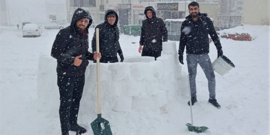 Kahramanmaraş'ta gençler, kar yağışı sonrası sokakta eskimo evi yaptı.