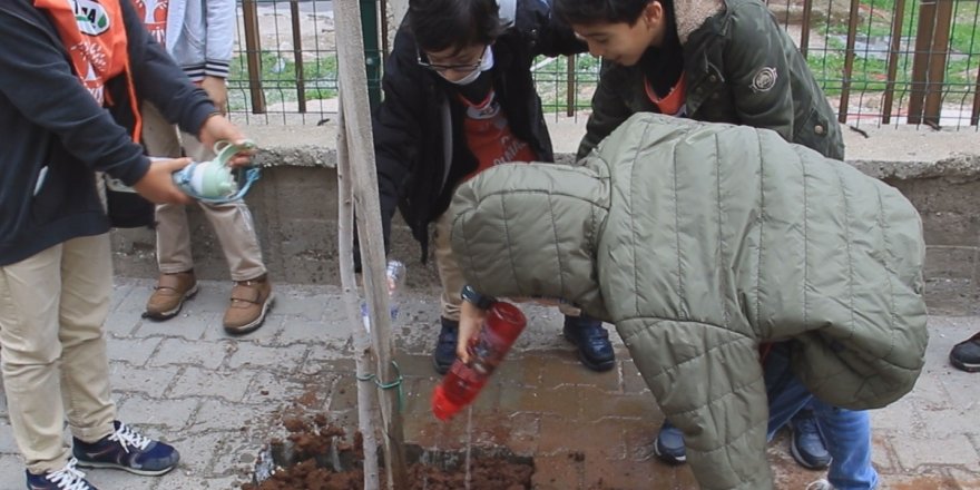 Fidanları toprakla buluşturan çocuklar, can suyunu suluklarıyla verdi