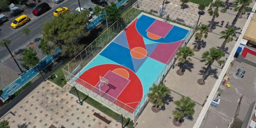 Antalya Büyükşehir Belediyesi'nin "Gençler Şehre Dokunuyor" projesi çerçevesinde gönüllü gençler Konyaaltı Sahili'ndeki basketbol sahalarını boyayarak, rengarenk yaptı.