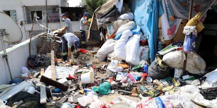 Mersin'in merkez ilçe Akdeniz Belediyesi Çevre Koruma ve Kontrol Müdürlüğü ekipleri, yaşlı ve hasta olduğu öğrenilen ev sahibinin oğlunun başvurusu üzerine, 2 katlı bir evden 3 kamyon dolusu çöp ve atık çıkardı.