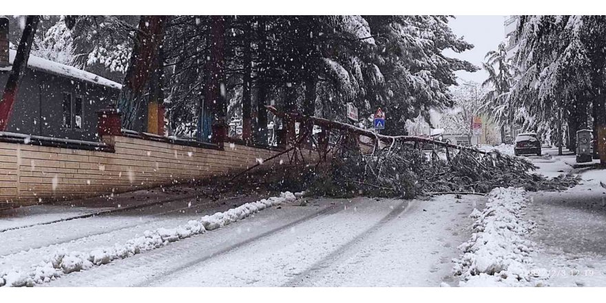 Isparta'da, sabah saatlerinde başlayan kar yağışı kent merkezinde etkili olurken, kar birikintisine dayanamayan ağaçlar devrildi.