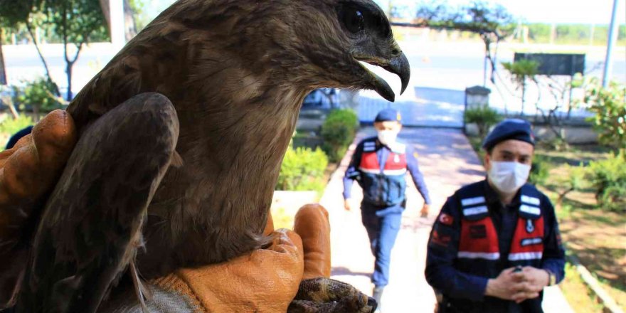 Mersin'de jandarma ekipleri, görev dönüşü yolda yaralı buldukları şahine sahip çıktı, tedavisi için hayvan doğa koruma ekiplerine ulaştırıldı.