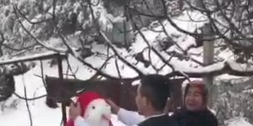 Yaptıkları kardan gelinin duvağını açan genç damat, kardan gelini alnından öptü.