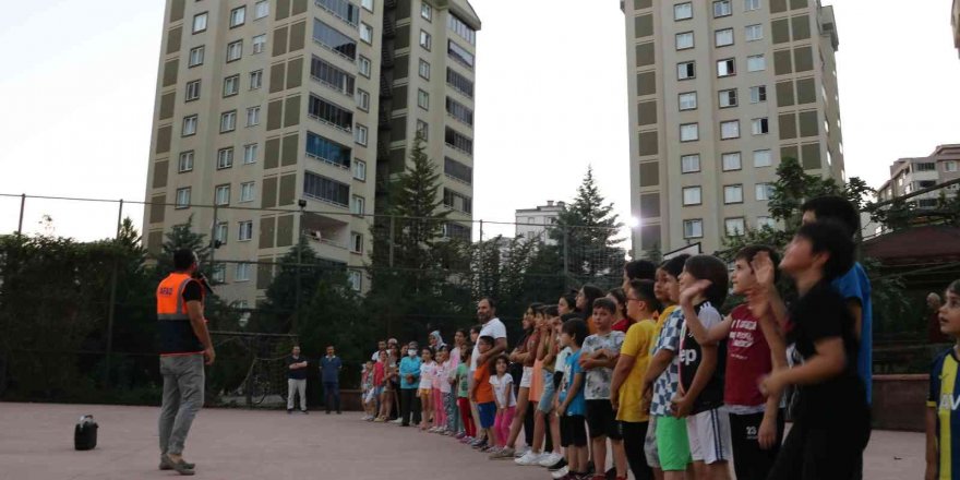 Toplanma alanında vatandaşların ve çocukların sorularını da yanıtlayan Coşkun, "Deprem meydana geldiğinde panik yapmadan çöp kapan uygulamasını yapıyoruz ve binaların merdiven kenarlarında acil olarak toplanma alanına gelmek durumundayız" dedi.