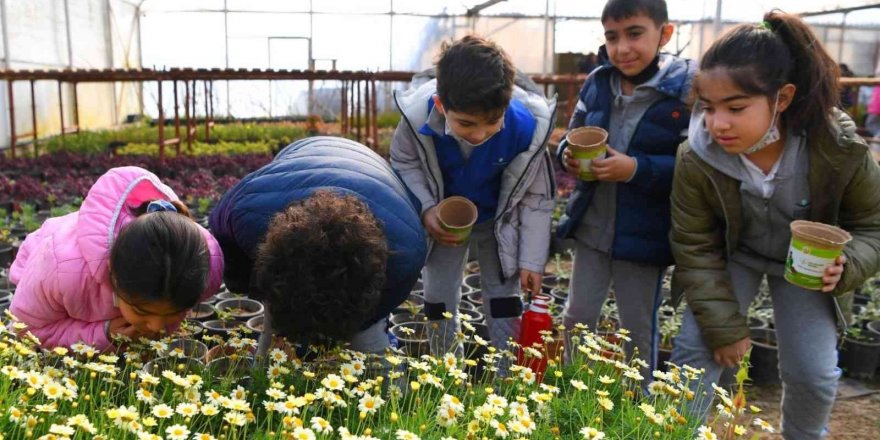 Konyaaltı Belediyesi Fidan Üretim Merkezi'ni ziyaret eden minik öğrenciler, hem uzmanlardan fidan dikimini öğrendi hem de uyguladı.