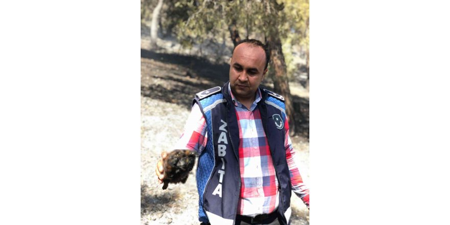 Orman yangınında telef olan kaplumbağanın görüntüsü zabıta personelinin yüreğini dağladı