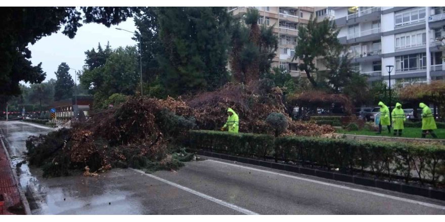 Adana'da aşırı rüzgar ve yağmur nedeniyle parktaki çam ağacı kökünden sökülerek yola devrildi.