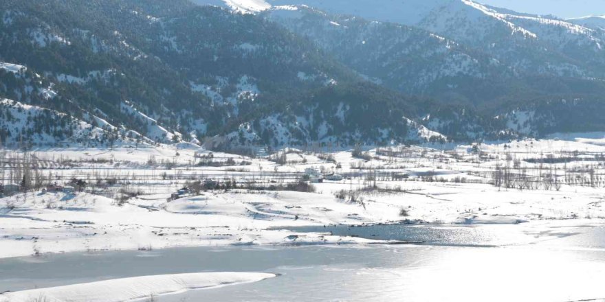 Kahramanmaraş'ta sular altında kalan köy, soğuk havanın etkisiyle buz tuttu.